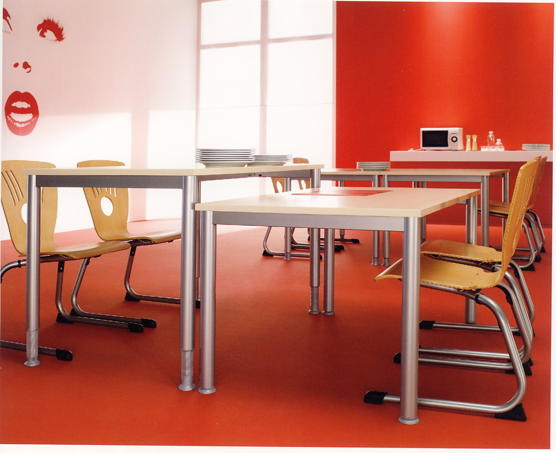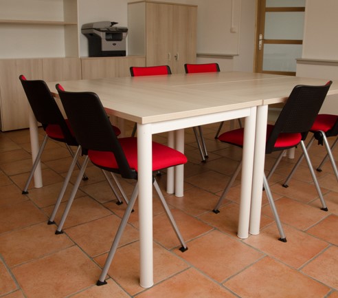 Tables rectangulaires de tailles et de largeurs différentes : longueur 120, 140, 160, 180 cm x largeur 70 ou 80 cm de large. Piètement cylindrique diam 55 mm, poutre de renfort et plateau mélaminé haute densité épaisseur 25 mm. 10 coloris possibles.
