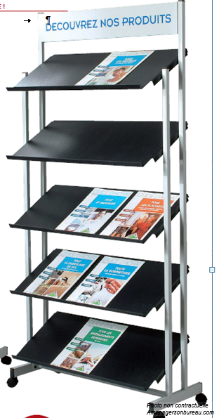Présentoirs de documents sur pieds ou muraux. Matériaux plastique ou métal.